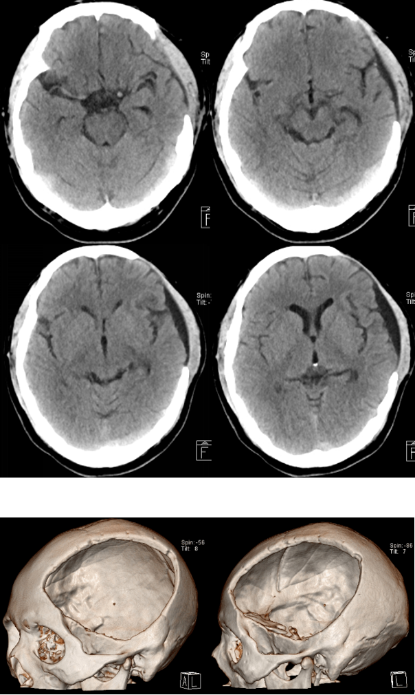 诊治经过:急诊全麻下行左侧额颞顶部去骨瓣减压术+硬膜下血肿清除术。