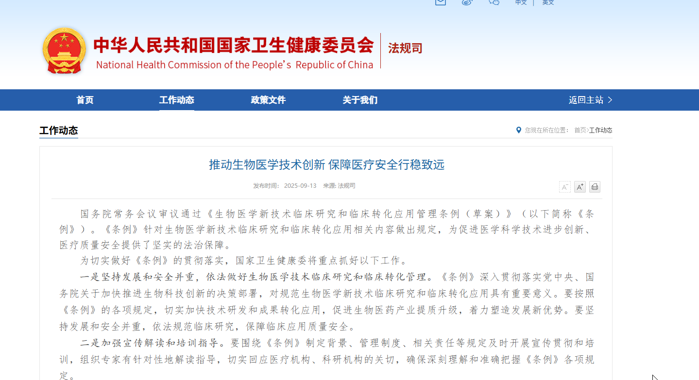19/09推动生物医学技术创新 保障医疗安全行稳致远国务院常务会议审议通过《生物医学新技术临床研究和临床转化应用管理条例(草案)》(以下简称《条例》)。《条例》针对生物医学新技术临床研究和临床转化应用相关内容做出规定,为促进医学科学技术进步创新、医疗质量安全提供了坚实的法治保障。