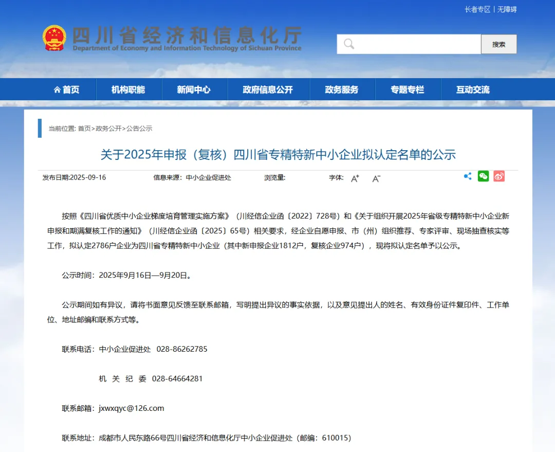 近日,根据《四川省优质中小企业梯度培育管理实施方案》(川经信企业函〔2022〕728号)和《关于组织开展2025年省级专精特新中小企业新申报和期满复核工作的通知》(川经信企业函〔2025〕65号)相关要求,经企业自主申报、区市推荐、专家评审和公示等程序,我公司凭借在技术创新、专业服务与市场潜力等方面的突出表现,成功通过认定,荣获2025年度四川省“专精特新中小企业”称号。